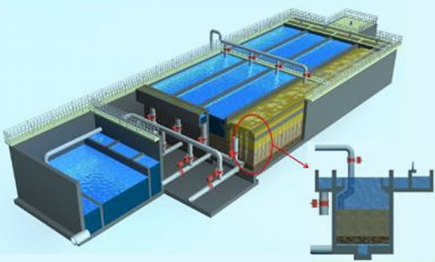 濾池進(jìn)水(通常是二沉池出水)→(旁路碳源投加系統(tǒng))→通過淹沒式水槽(實(shí)現(xiàn)無充氧進(jìn)水)→進(jìn)入水體→通過獨(dú)特的選擇2—4mm粗顆粒和足夠的厚度(1.8m以上深床)的均質(zhì)濾料有效截留懸浮物→出水超長的蓄污帶