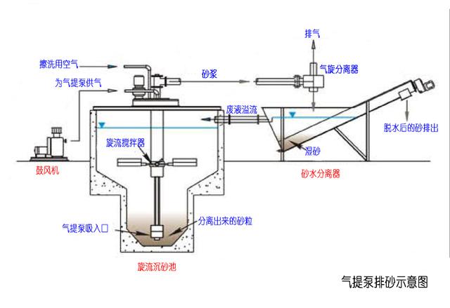 氣體泵,裝置在旋流沉砂池的頂部,使用工廠壓縮空氣或許專用鼓風機供壓縮空氣,間歇地將砂從池底部抽出來,將砂漿提升至砂水別離器。