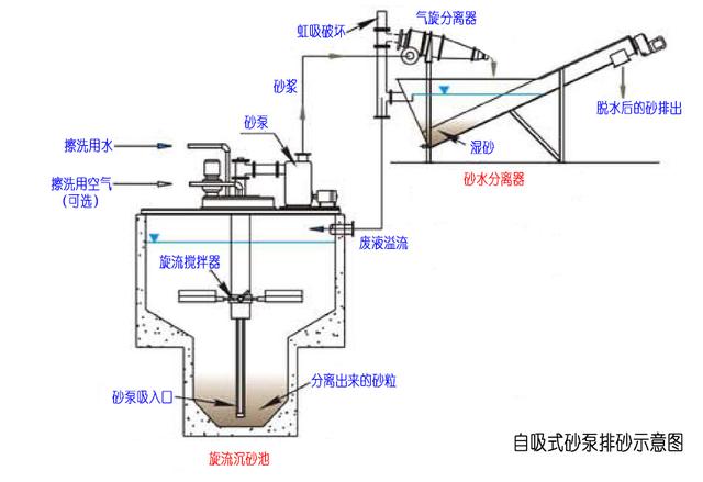 自吸砂泵,是葉輪砂泵,裝置在旋流沉砂池的頂部,間歇地將砂從池底部抽出來,將砂漿提升至砂水分離器。